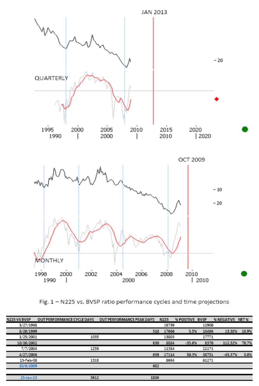 To bring out this performance cyclicality we have studied pair performance between the BRICs countries and Nikkei, based on three 36-40 month time horizon in the 10 -12 year larger economic cycle (Fig.1, Fig. 2, Fig. 3, and Fig. 4). We used the first derivative (rate of change indicator) of the pair lines (ratio between the prices of the two indices, black line). We could see a performance cycle formation both on long term (10-12 years) and short term (36-40 months) in the illustrated cases (marked by red). We saw most pairs deliver positive performance (Table 1, Table 2, Table 3 and Table 4) if one was positive on one country (economic zone) and negative on the other. The findings suggest that there is 10-12 year cyclical performance which should repeat till 2015 on a larger time frame and till 2009-2011 on a shorter time frame. The performance time frames were illustrated in the respective workings (vertical red lines) using half of the previous performance cycle, 5-6 years for larger time frames and 15-20 months for smaller performance time cycles.